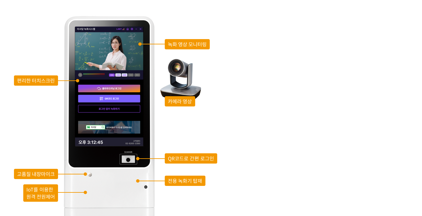 녹화 시스템, 터치모니터, 흡음마이크, 오디오 인터페이스 전원 제어기가 내장된 일체형 시스템
